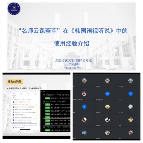 大连民族大学的文英熙老师以线上方式参会,分享了名师云课荟萃”在本科三年级课程《韩国语视听说》中的使用经验。文英熙在课程设计中,充分运用了平台中现有的语法知识点资源,并通过自主添加符合实际教学需要的图片、音视频及PDF资料,打造了一门以培养员工的语言应用能力为主要目标,以员工为本,注重小组合作学习,提高员工自主学习能力的课程。文老师的课程设计思路和平台使用技巧带给了与会教师极大的启示,也提出了许多具体而实际的意见和建议。