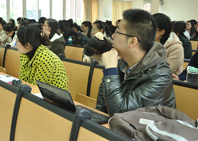随后,王向远提出了具有个人特色的三元理论:打破直译意译两种翻译方法的二元对立,建立以迻译(移译)、释译、创译为支柱的翻译方法体系,比直译意译更为适合中国翻译文学的特色;打破正译和误译两种翻译判断的二元对立,提出“缺陷翻译”的观点营造中间地带,柔化非此即彼的粗暴判断;打破洋化和归化两种翻译风格的二元对立,提出“融化”的概念将二者融为一炉,使得翻译文本更尽善尽美。这套理论极富新鲜感,加上王教授风趣幽默的讲解,因此,在座师生都全神贯注地听讲。