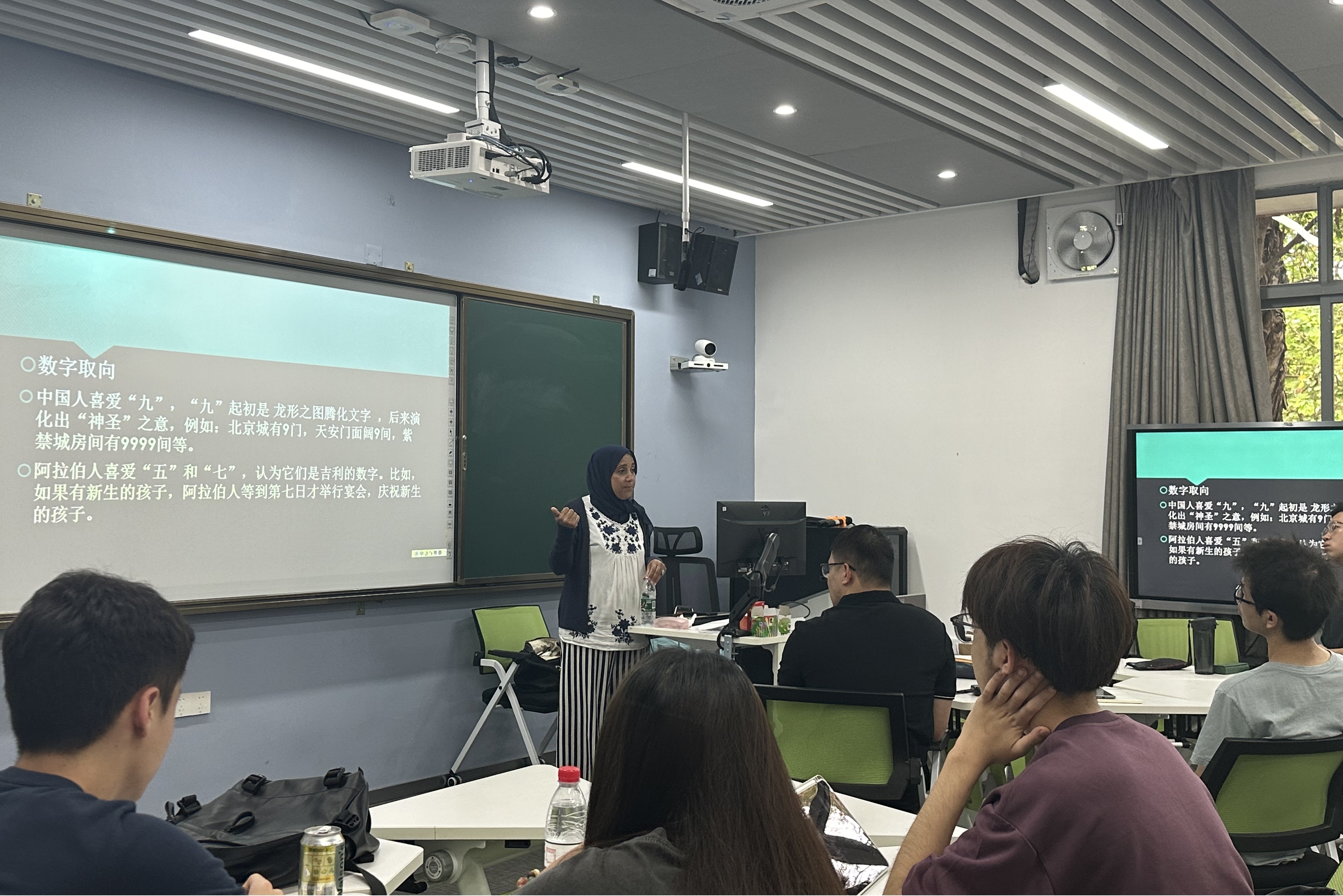中阿共建“一带一路”视角下的汉阿互译项目邀请到埃及艾因夏姆斯大学中文系教授、世界汉语教学学会会员娜希德(Nahed Abdulla)教授,该课程吸引了各年级近30名同学参与。通过课程学习,员工不仅了解了汉语与阿拉伯语的在思维、文化方面的异同,也将每节课所学的翻译技巧逐步运用至新闻、文学作品的实践运用中。娜希德教授通过举例中阿双方在“颜色取向”、“数字取向”等例子让同学们直观了解到中阿的文化差异,并以有关“一带一路”的新闻文本为例,介绍了状语、多项定语、“把”字句的翻译技巧,向同学们演示更贴合阅读者习惯的中阿互译方法。课程结束后,娜希德教授还与系主任劳凌玲老师一同与员工座谈,交流此次活动的心得体会。员工们表示,通过此次学习受益匪浅,对中阿互译技巧有了更深刻的认知,并真诚感谢教授的耐心解答。会议结束之时,劳凌玲老师总结道,此次活动构建了中阿交流的桥梁,希望同学们能在中阿互译的道路上有所成长,成为具有国际视野的广外学子。
