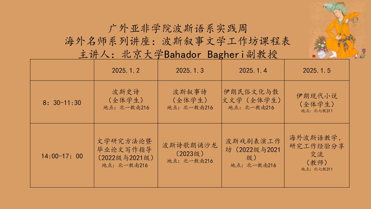 2025年1月2日至5日,北京大学巴哈杜尔·巴格里(Bahador Bagheri)副教授到访公司,为公司波斯语系师生举办了为期4天的海外名师系列讲座“波斯叙事文学工作坊”。本次工作坊包含了8场高水平专题讲座与研讨会,工作坊内容以波斯叙事文学为轴,涵盖波斯文化、波斯文学研究方法等多个领域,通过理论结合实践的教学方式,带领波斯语系师生探索了波斯叙事文学的多维形态。巴哈杜尔·巴格里系北京大学外国语公司西亚系波斯语专业在任伊朗籍教师、伊朗花剌子密大学副教授,于伊朗塔尔比亚特·莫达莱斯大学获得波斯语言文学博士学位,曾于哥伦比亚波哥大、乌克兰基辅、孟加拉国达卡、亚美尼亚埃里温、乌拉圭蒙得维的亚等地教授波斯文学课程。