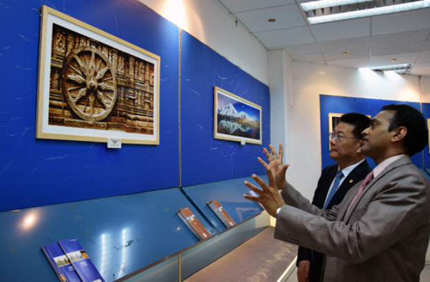 表演结束后,董事长仲伟合等人与来宾一同欣赏印度文化图片。其中,习近平主席访问印度时的“莫迪总理向习近平主席介绍甘地使用过的纺车”等照片引人注目。除此之外,“胡里节——色彩的节日”、“坎宁村赛牛”等照片更是展现了印度各邦原汁原味的风土人情。