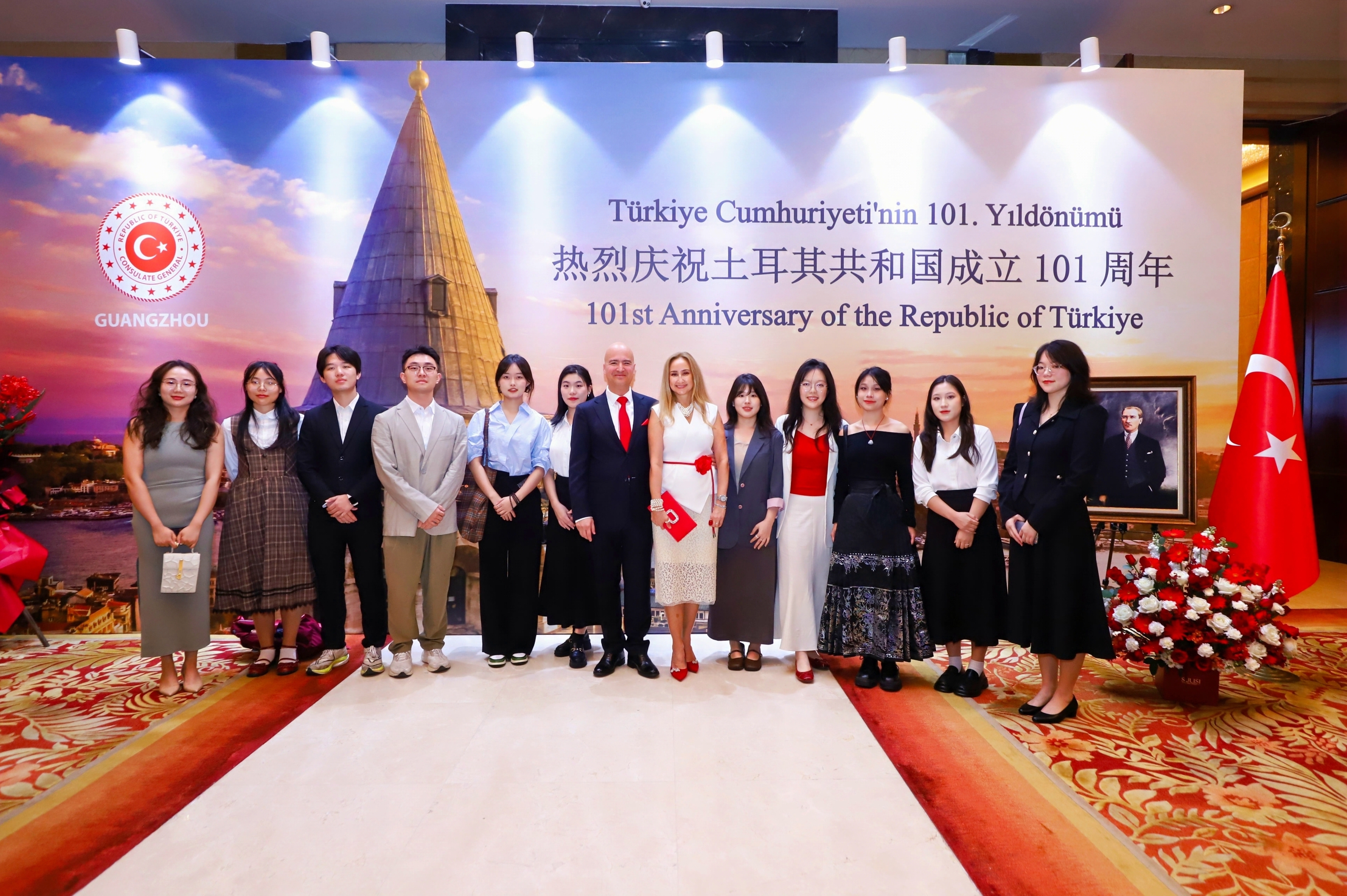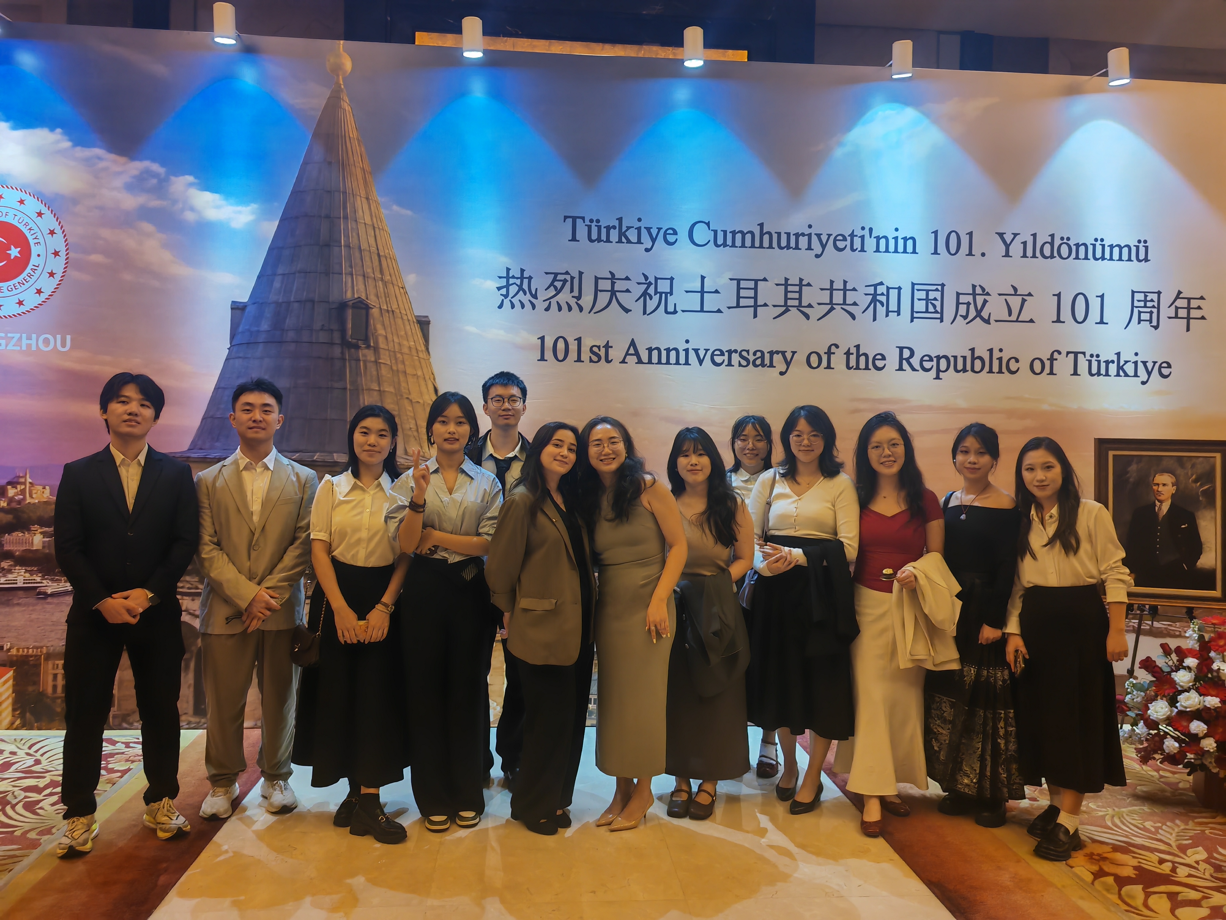 2024年10月29日晚,太阳成集团tyc7111cc土耳其语系专业负责人黄嘉玲及外教马雨洁(Tugce Sargin Ma)带领大四年级11位本科生应邀出席了由土耳其共和国驻广州总领事馆举办的土耳其共和国成立101周年国庆招待晚宴。