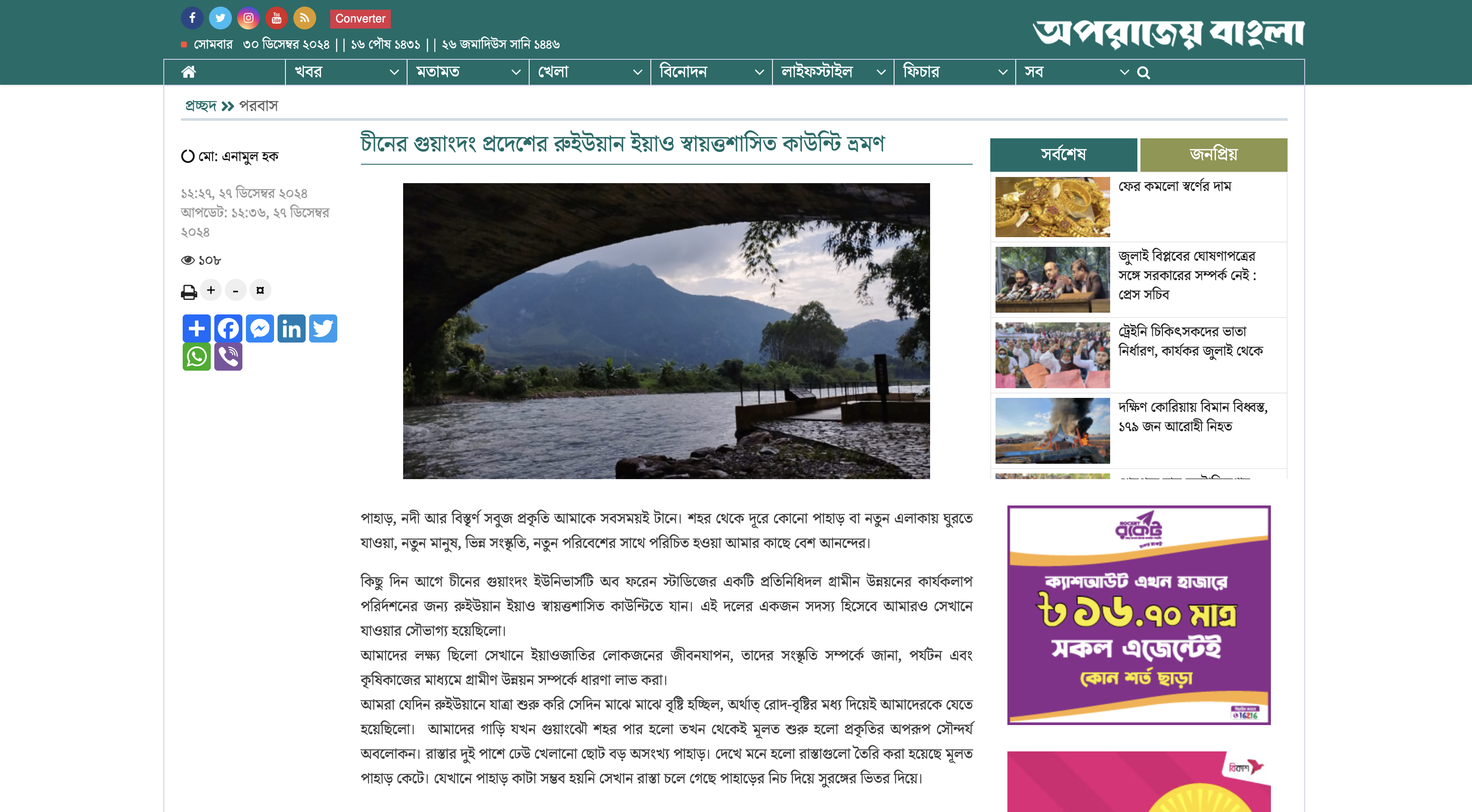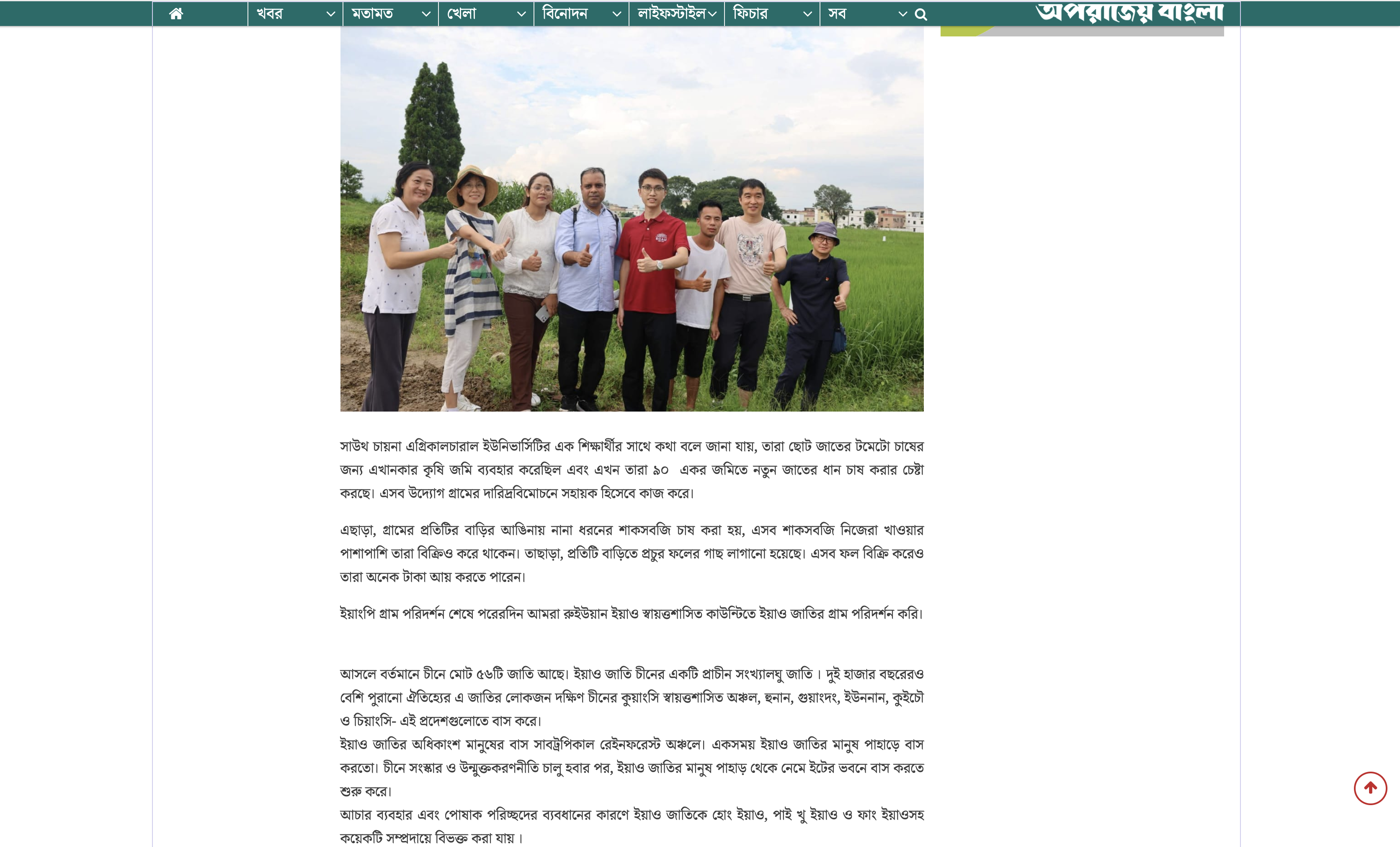 本网讯 近日,太阳成集团tyc7111cc孟加拉语专业外籍教师伊纳穆勒·毫克用孟加拉语撰写了宣传公司乡村振兴工作和介绍瑶族文化的文章,发表在了孟加拉国媒体网站Aparajeobangla上。Aparajeobangla是孟加拉国的孟加拉语——英语在线新闻门户网站,广受孟加拉国年轻读者的欢迎。