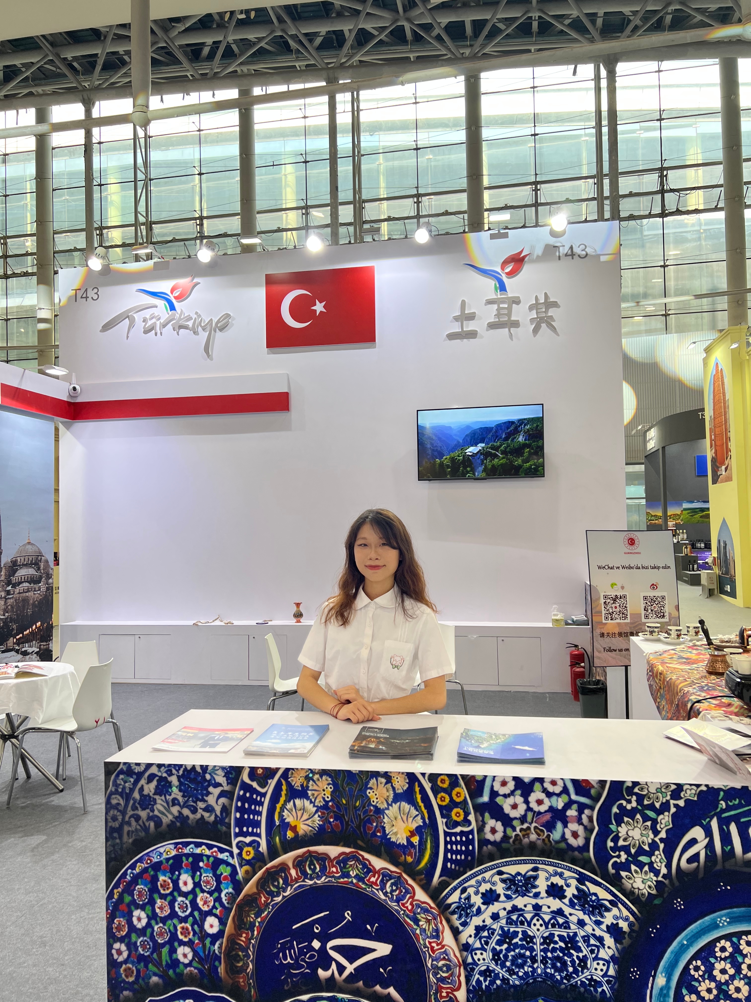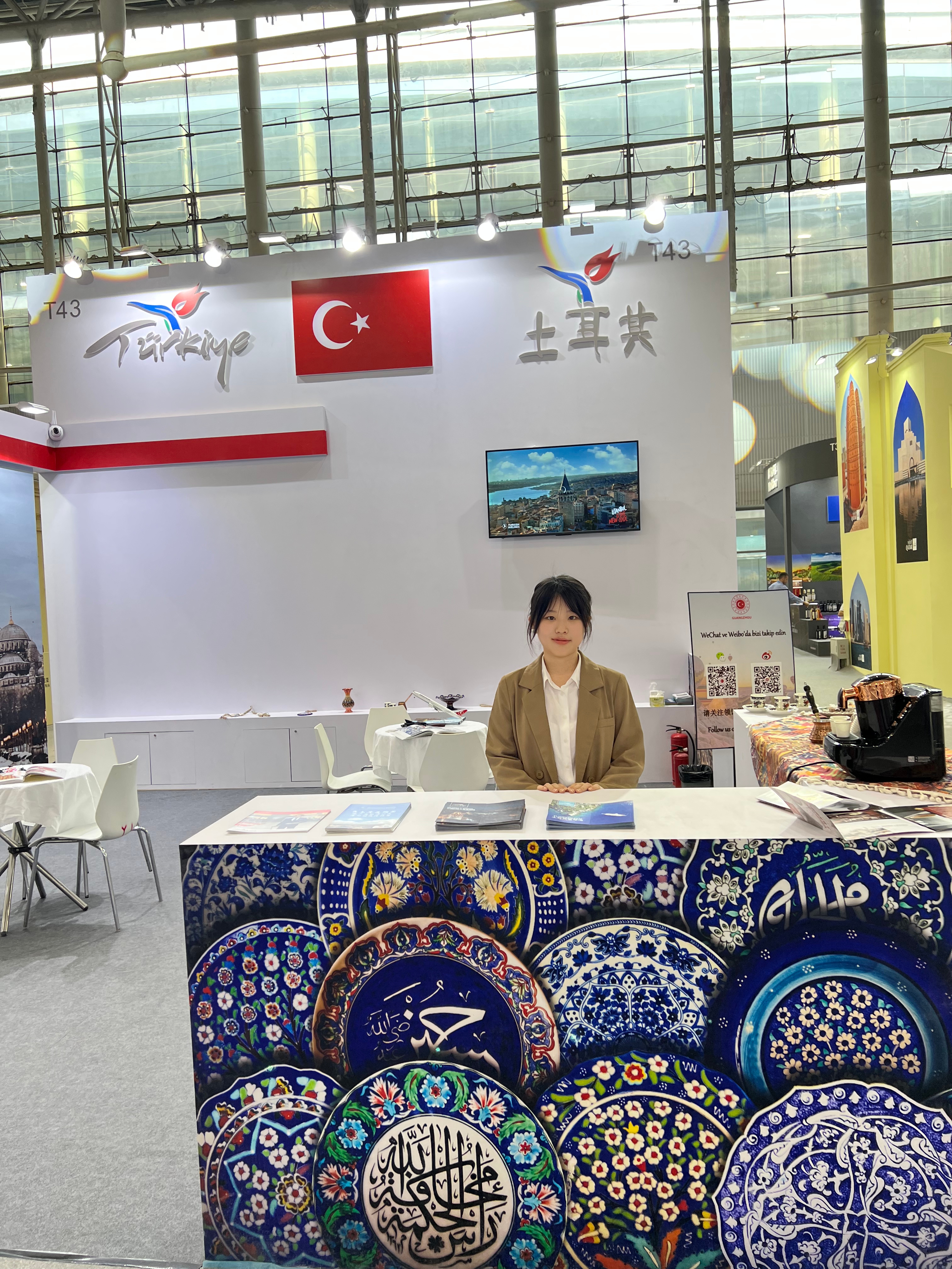 展会第二天,前往土耳其国家馆的访客络绎不绝,不少国际参展商和普通民众都前来了解土耳其独具魅力的文化和旅游资源。大二年级的胡静涵与张慧同学在忙碌的宣传与介绍工作中度过了充实的一天。