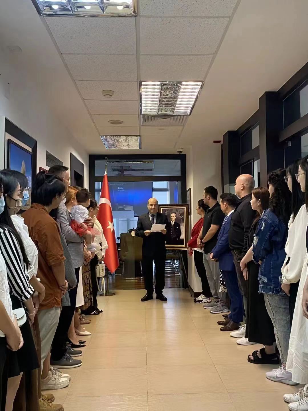 总领事库特鲁·阿义砍(Kurtuluş Aykan)带领领馆工作人员热烈欢迎了广外师生的到来,并感谢广外对土耳其语建设和促进中土两国友谊所做的工作。总领事库特鲁·阿义砍向全体师生介绍了土耳其国父穆斯塔法·凯末尔·阿塔图尔克的光荣事迹与5月19日作为土耳其独立战争起点的非凡意义。总领事库特鲁·阿义砍希望中土两国青年能齐头并进,积极展现强大的青年力量。