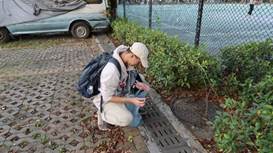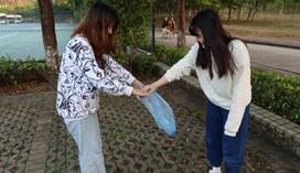 发展对象第二小组成员在北校区体育公园石牌前集合完毕后,统一在篮球场与网球场四周进行清洁工作。发展对象成员们按要求自备垃圾袋,围绕运动场自觉清理草丛中与校道上掉落的瓶盖、包装纸等垃圾,并根据垃圾收集分类规范放入了垃圾桶。