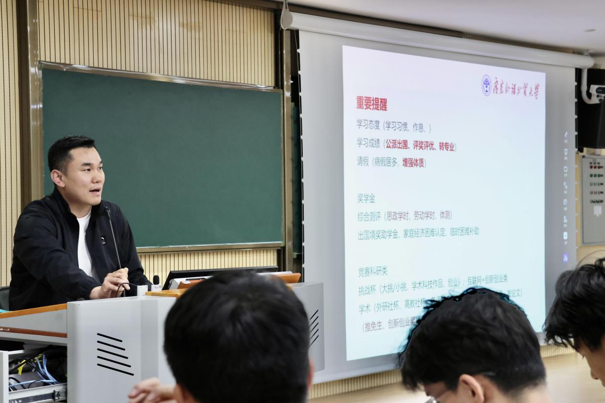 会上,辅导员蔡昊老师着重强调了端正学习态度的重要意义。他殷切鼓励同学们养成良好学习习惯,科学合理规划作息,以切实有效的行动提高学习效率,稳步提升学业成绩。蔡老师特别指出,学业成绩作为员工综合素养的重要体现,不仅关乎奖学金评定、荣誉称号授予,更在申请公派出国交流、转专业等关乎个人发展的关键节点上,发挥着决定性作用。同时,他提醒同学们要积极参与体育锻炼,保持健康体魄,为充实的学业和精彩的校园生活筑牢根基。