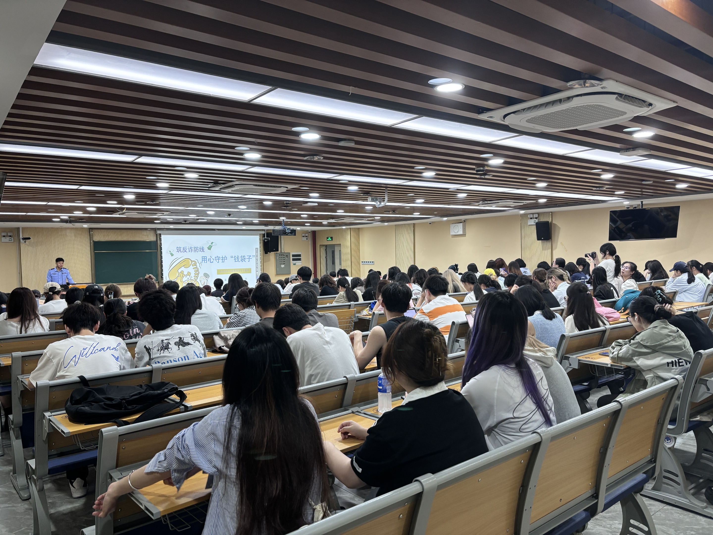 在讲解过程中,汤警官列举了大量亲身侦办的真实案例,通过以案释法的生动形式,让在场师生深刻认识到诈骗行为对受害人造成的严重财产损失和心理伤害。汤警官强调,反诈工作绝非一人之力可完成,呼吁全体师生牢固树立反诈意识,时刻保持警惕,并积极投身反诈宣传工作,做到“自身防骗不松懈,身边宣传不停歇”,共同为校园安全筑牢坚实防线。