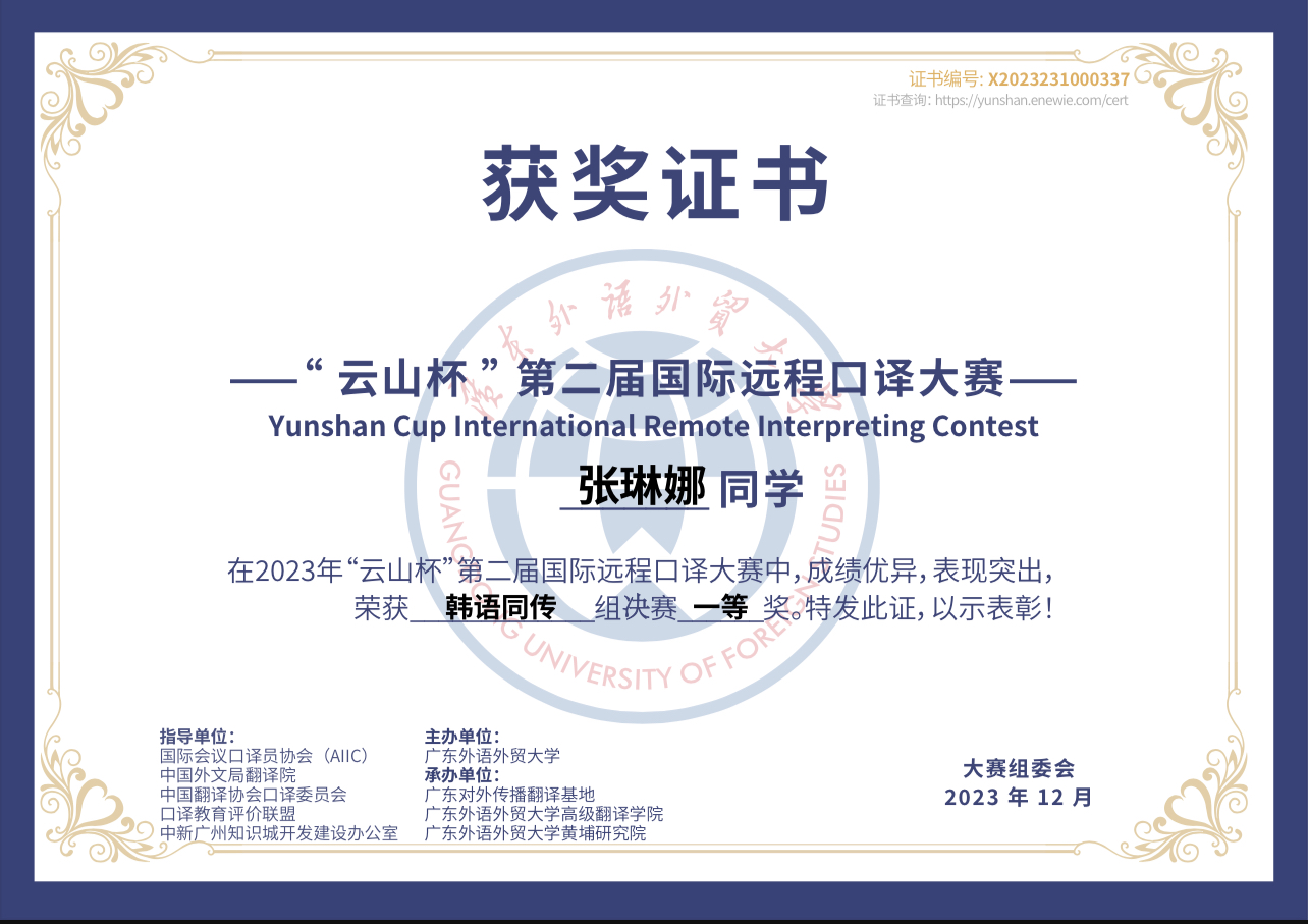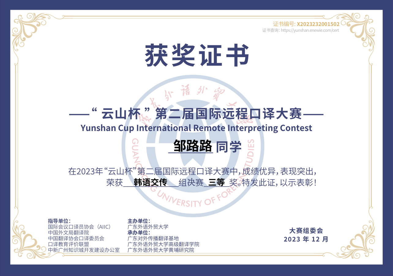 本次大赛由国际会议口译员协会(AIIC)、中国外文局翻译院、中国翻译协会口译委员会、口译教育评价联盟、中新广州知识城开发建设办公室指导,太阳成集团tyc7111cc主办,旨在培养一批能胜任各领域对外远程交流任务、擅长中译外国际传播的高素质翻译人才,推动语言服务行业创新发展,服务国家战略需求。几位获奖同学表示:“很荣幸决赛中斩获荣誉,这离不开公司、公司的培养以及朝鲜语口译专业老师们的严格要求和悉心指导,未来我们也会不忘初心,再接再厉。”