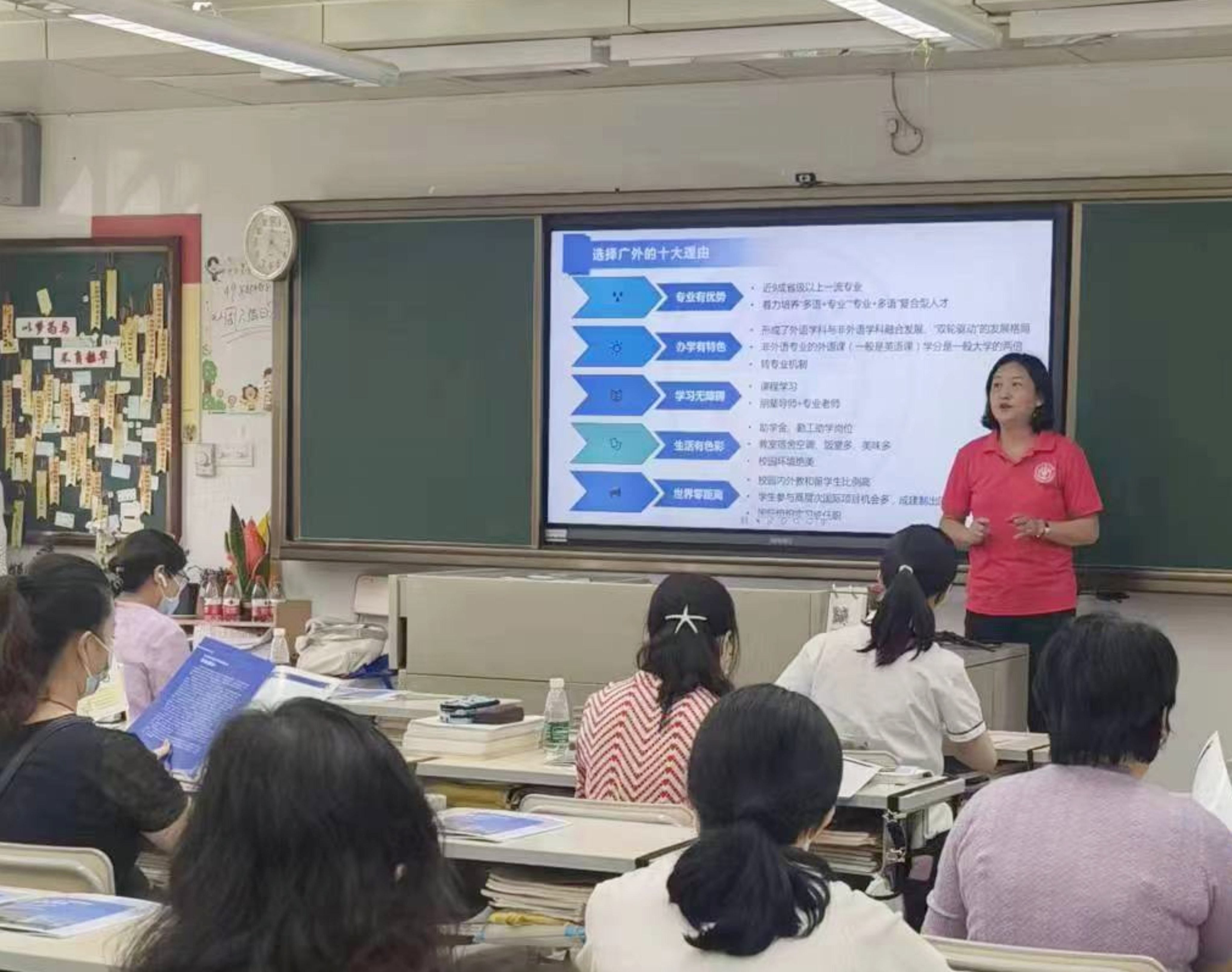 首先,梁洁书记从询问家长和员工关心的问题切入,详细介绍了公司概况、学科实力、教学团队、人才培养、国际交流、员工活动及助学济困等情况,强调了广外的特色办学理念、一流专业建设和跨学科跨专业融合培养复合型人才的模式,以图片和视频等方式展现了国际化活动丰富多彩、高端实践平台多种多样的广外,多角度、多方位、多层次地帮助广东实验中学的员工们和家长们搭建起对广外的整体认知,鼓励更多的优秀学子报考广外。