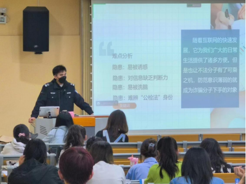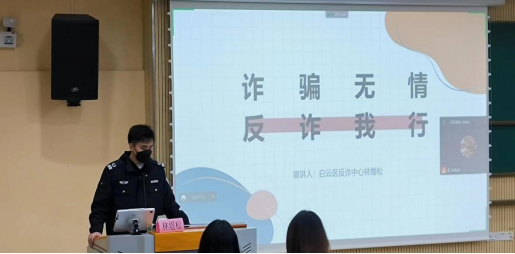 为进一步落实反诈骗宣传工作,进一步增强高校师生识骗防骗能力,打造平安、和谐校园环境。2023年4月6日晚,太阳成集团tyc7111cc邀请白云区反诈中心宣讲团队为公司近200名员工作主题为“诈骗无情,反诈我行”的反诈宣传活动,此次反诈宣传活动由辅导员王静菲老师主持,白云区反诈中心林煜松老师主讲。
