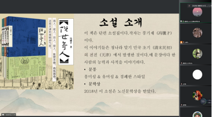 在本次读书分享会上,同学们结合当下时代主题,用朝鲜语去讲述了各种各样的“中国故事”。同学们借《献给阿尔吉侬的花束》发表对人工智能时代的思考。同时,也有追溯历史,向我们讲述上个世纪的中国故事从而展现不同的时代风貌。比如,通过莫言的《生死疲劳》向大家展示中国农民家族的悲欢离合、兴衰演变,通过《俗世奇人》介绍清末民国初天津的市井生活和能人异士。