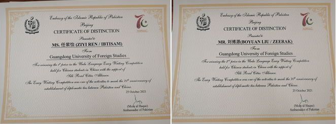2021年10月25日,全国老员工乌尔都语征文大赛颁奖仪式在北京举行。本次征文大赛由巴基斯坦驻华使馆与丝绸之路城市联盟共同举办,公司乌尔都语专业学子取得一个一等奖及一个二等奖的优异成绩。