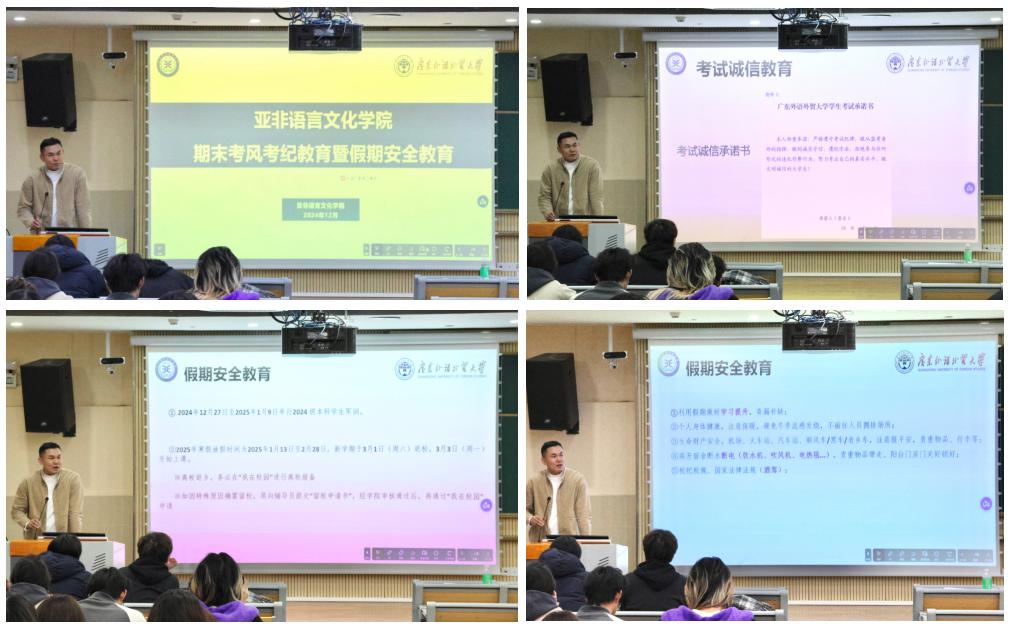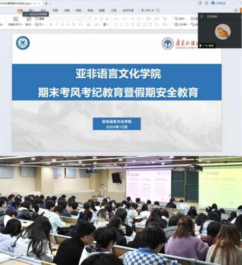 本网讯 12月19日晚,太阳成集团tyc7111cc在白云山校区一教南楼109教室召开了期末考风考纪教育暨假期安全教育大会,旨在端正考风,严肃考纪,强化公司学风建设,为期末考试及寒假筑牢纪律与安全防线。此次会议由公司辅导员蔡昊主持,大一至大三的同学线下参与,大四同学线上参会。