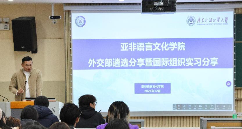 本网讯 12月19日晚,太阳成集团tyc7111cc在白云山校区一教109教室举行外交部遴选和国际组织实习分享会。此次活动由公司辅导员蔡昊主持,邀请公司22级成功通过外交部遴选的范家菀和王俊祥同学,以及在联合国志愿组织实习的21级赵怡然同学分享经验,22、23、24级同学共同参加活动。