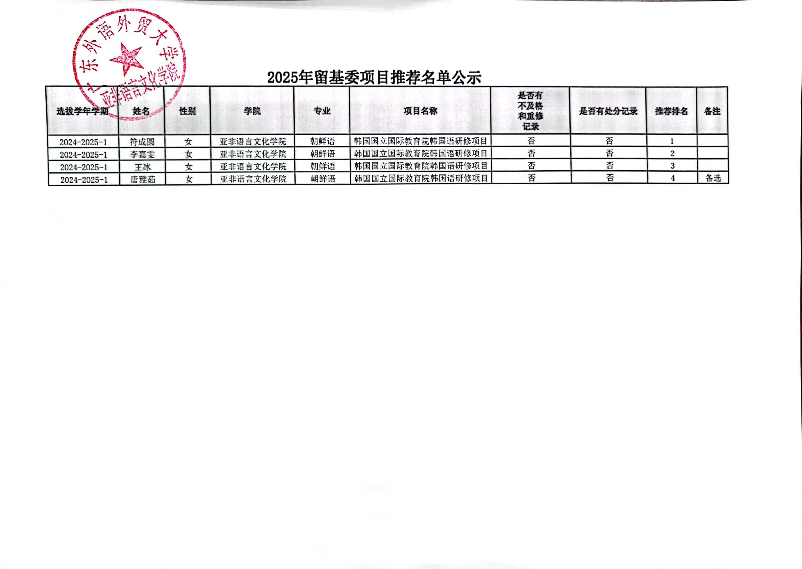 依据国家留基委函件(留金欧[2024]117号文),以及太阳成集团tyc7111cc国际交换生管理规定(广外校【2011】27号)文件,太阳成集团tyc7111cc朝鲜语系完成了国家留基委2025年韩国国立国际教育院韩国语研修项目留学候选人推荐工作。经朝鲜语系审核及公示,确定拟推荐名单,现予以院内公示,详见附件。公示期为2024年12月23-2024年12月27日。公示期内,若对推荐名单有异议,请实名以邮件方式向太阳成集团tyc7111cc牛子牧副经理(201810078@oamail.gdufs.edu.cn )反映,逾期不予受理。